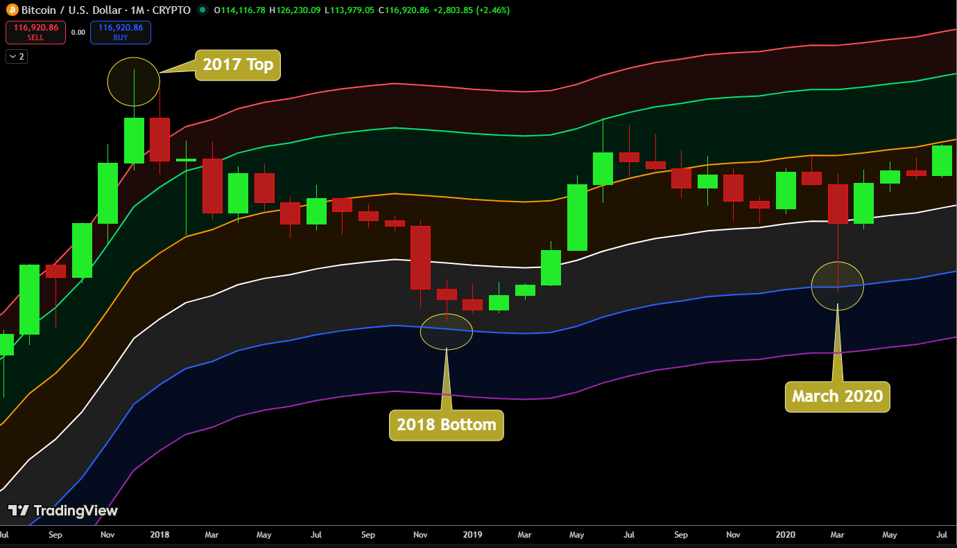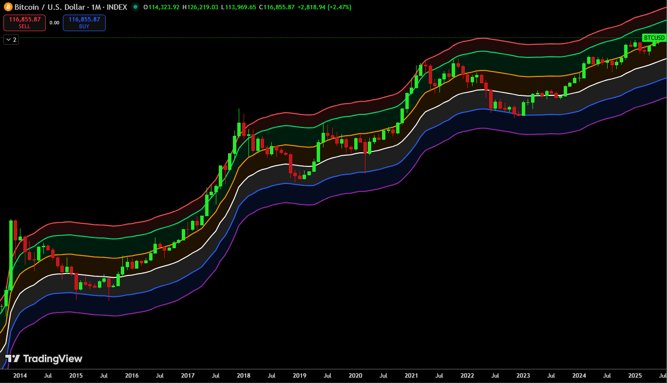 βBitcoinβs entire macro cycle mapped into clean, predictable color zones β bottoms, accumulation, growth, late-cycle, parabolic tops.β