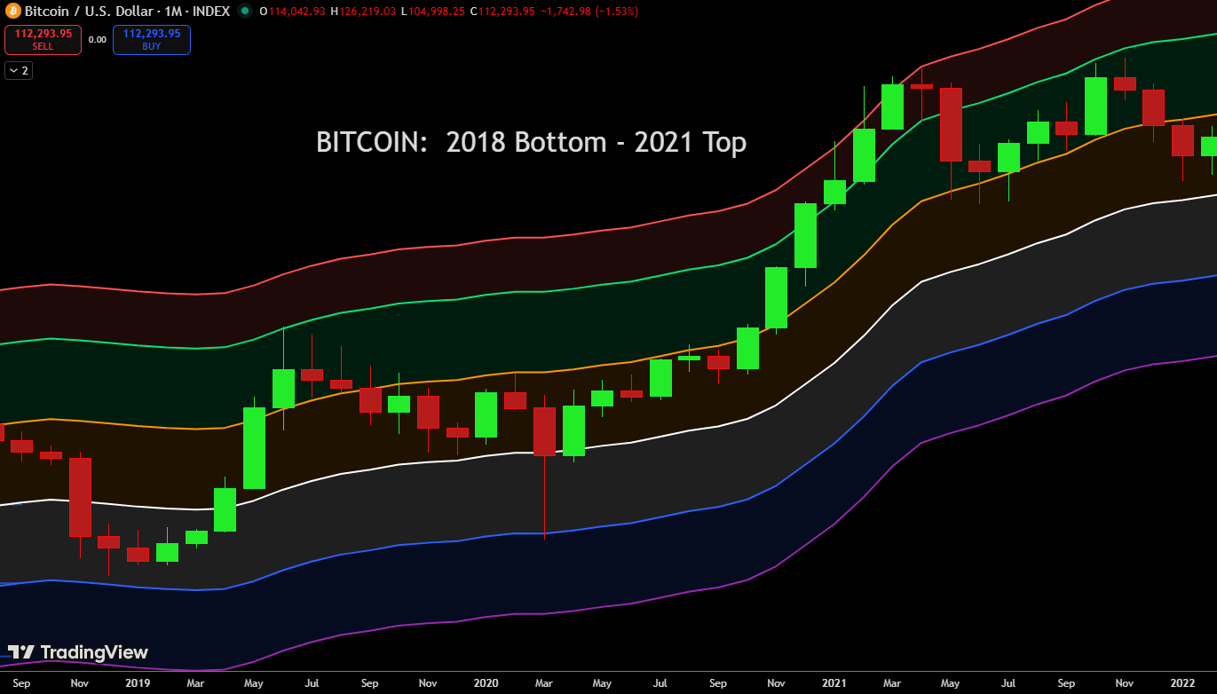 Reveals Bitcoinβs full macro cycle zones: bottoming β fair value β late-cycle β realistic top β parabolic top.