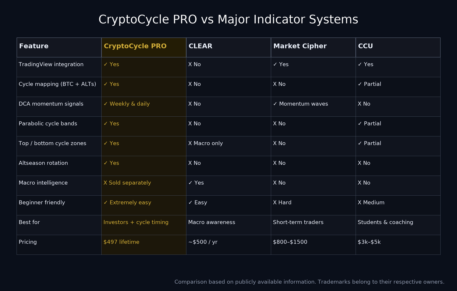 Built from the same macro and cycle frameworks inside The Crypto Wealth Playbookβ’, the CryptoCycle PRO suite turns those concepts into precise, real-time TradingView signals you can use every single day.